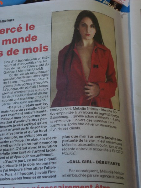 J’ai pas voulu me rendre toute seule au dépanneur pour acheter le journal Photo Police, parce que je suis sur le cover et que le gros titre est Escorte pendant deux ans Mélodie Nelson – native de Repentigny – prépare un autre bouquin à succès. Mon frère Gabriel a décidé de m’accompagner et de crier dans le dépanneur : « Aie c’est ici qu’on venait s’acheter des bonbons quand on était petit. Aie c’est ma sœur dans le Photo Police! » Je suis devenue rouge rouge rouge, mais j’ai trouvé cute mon frère d’attirer l’attention de la jolie caissière et de tous les vieux messieurs en chemises à carreaux.