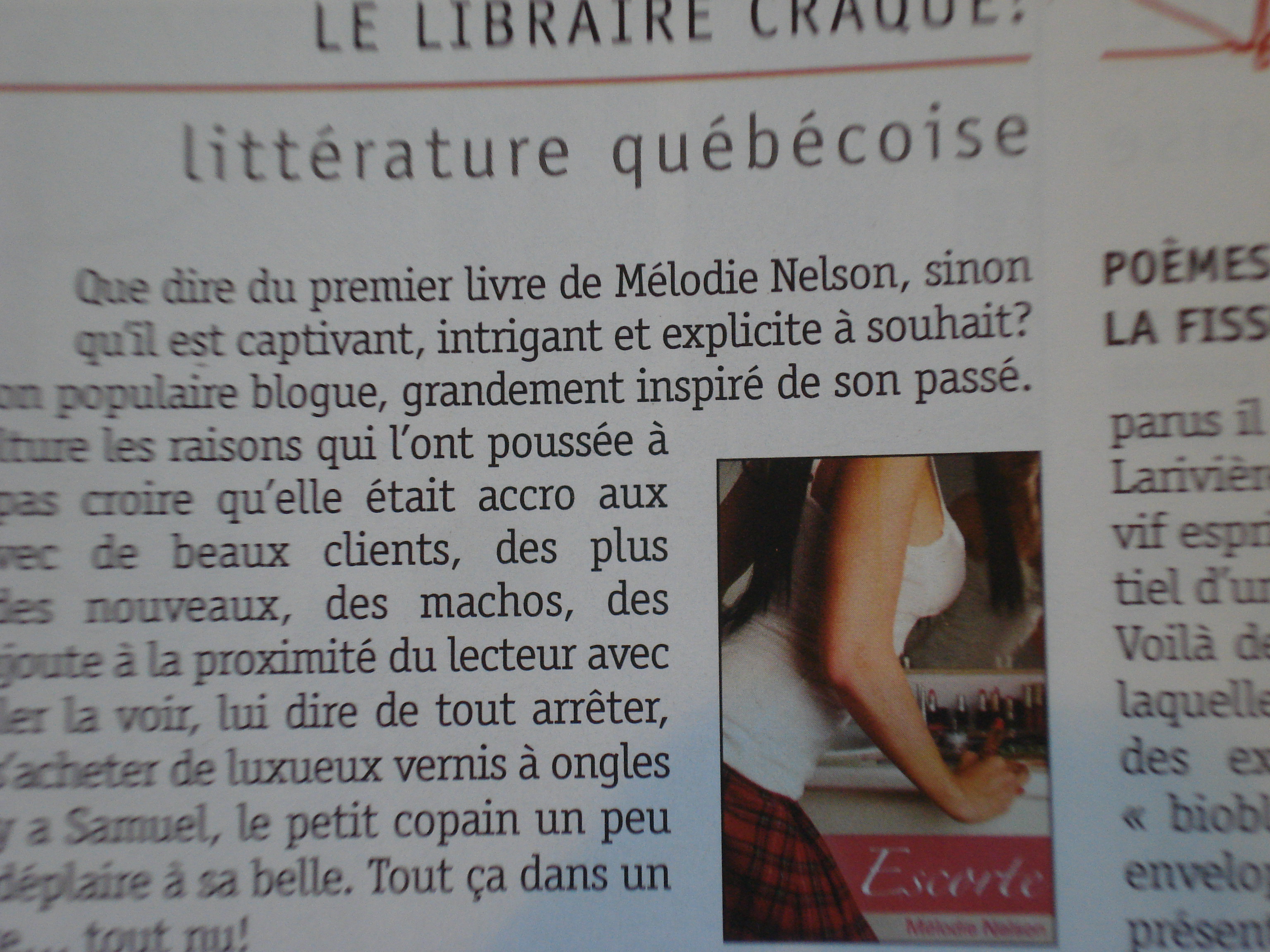 Je me retrouve dans le numéro du Libraire août-septembre, dans une vidéo de la splendide Cindy Cinnamon et dans Merb, le site préféré des amateurs d’escortes de Montréal. J’étais toute joyeuse de savoir, grâce à un ex client fier de moi, qu’il y avait une discussion à propos de mon livre Escorte sur ce site.