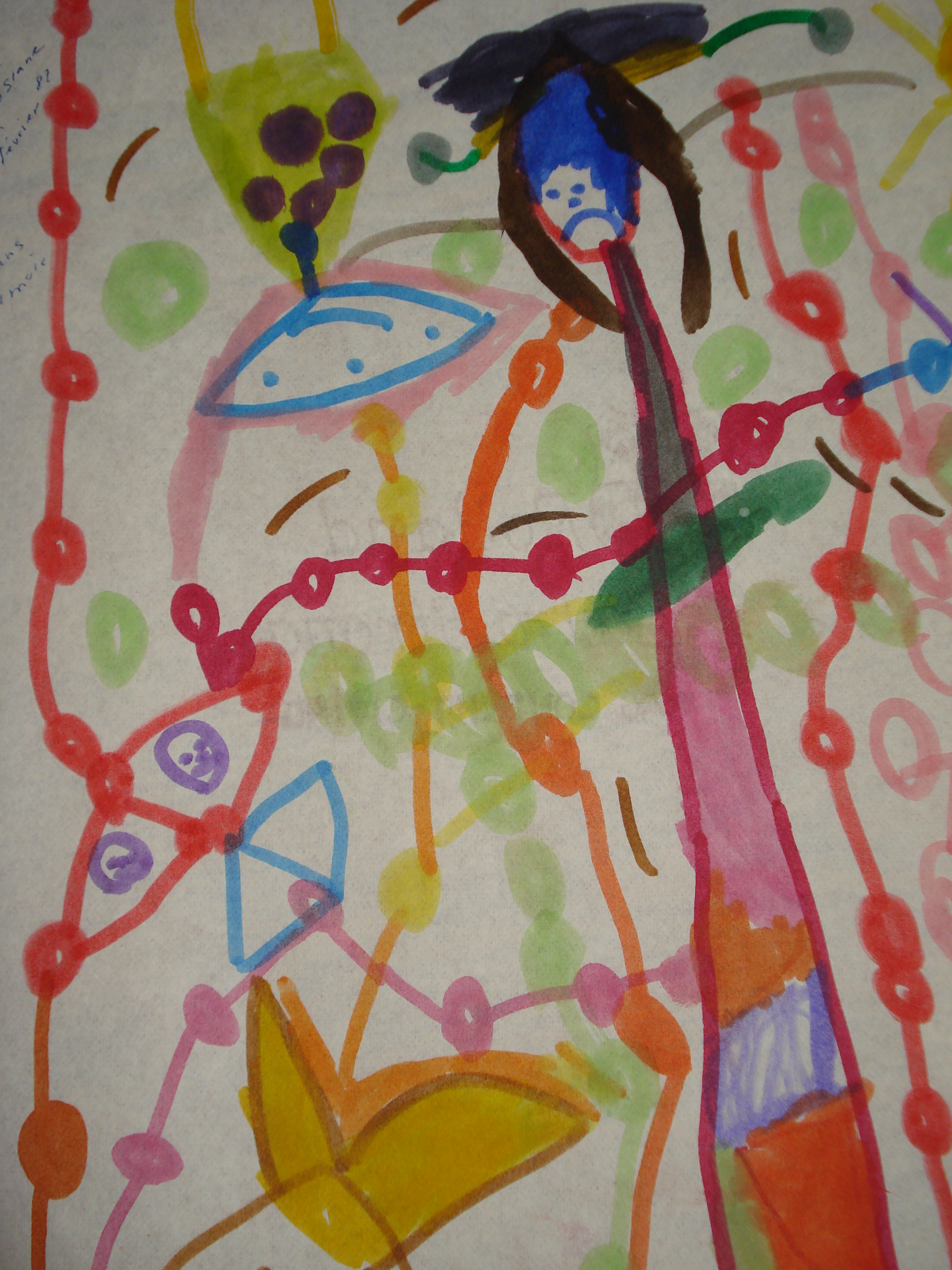 Après avoir mangé trop de croissants et bu du vin rouge comme si c’était aussi essentiel que du café au lait un dimanche d’après-midi, je regarde des dessins que ma maman a conservé dans des boites. Je trouve qu’à cinq-six-sept ans j’étais très bonne et pleine d’imagination (des canettes d’Orange Crush qui poussent dans des arbres ! des Calinours invités à des parties de balle-molle !)