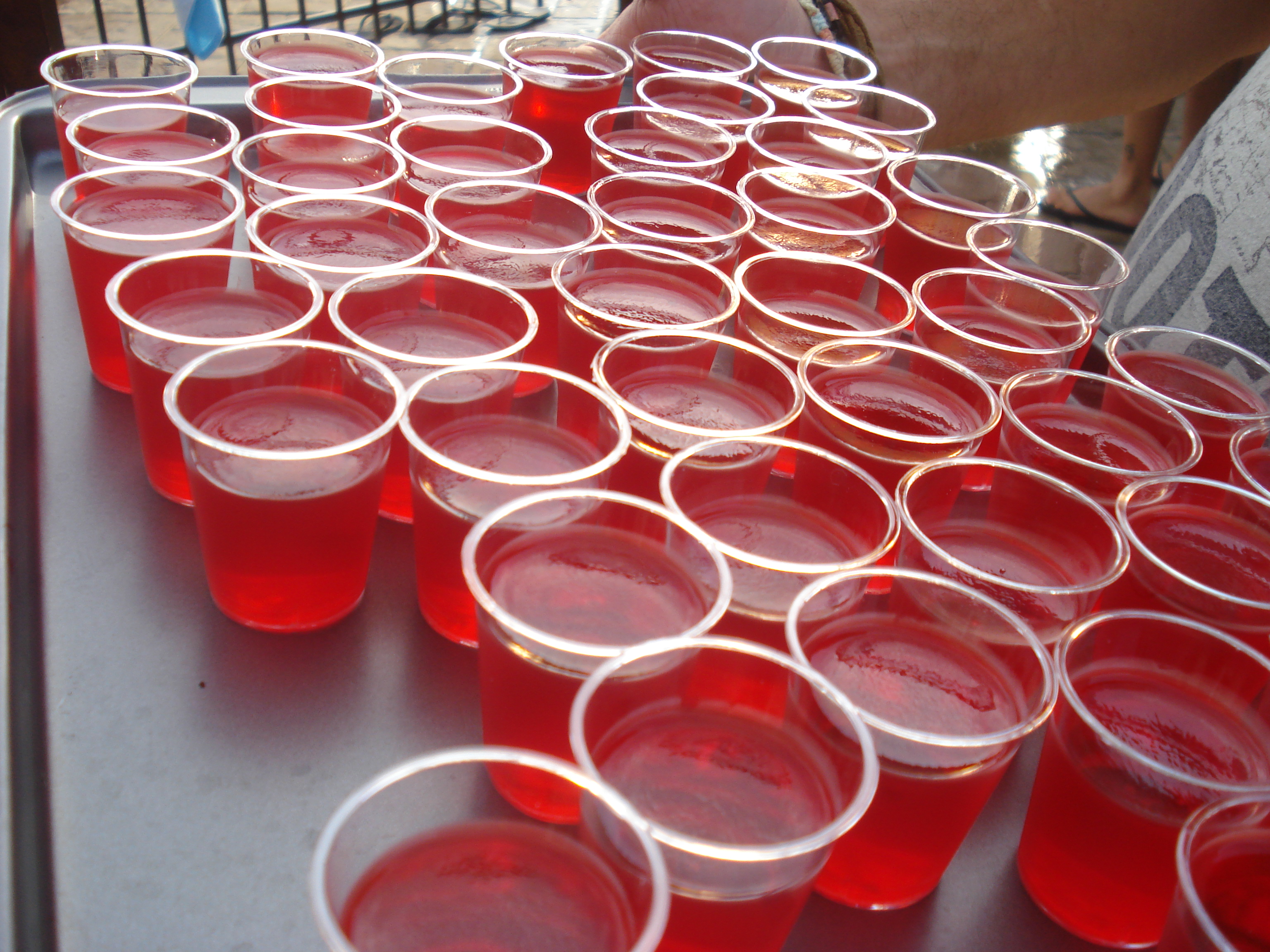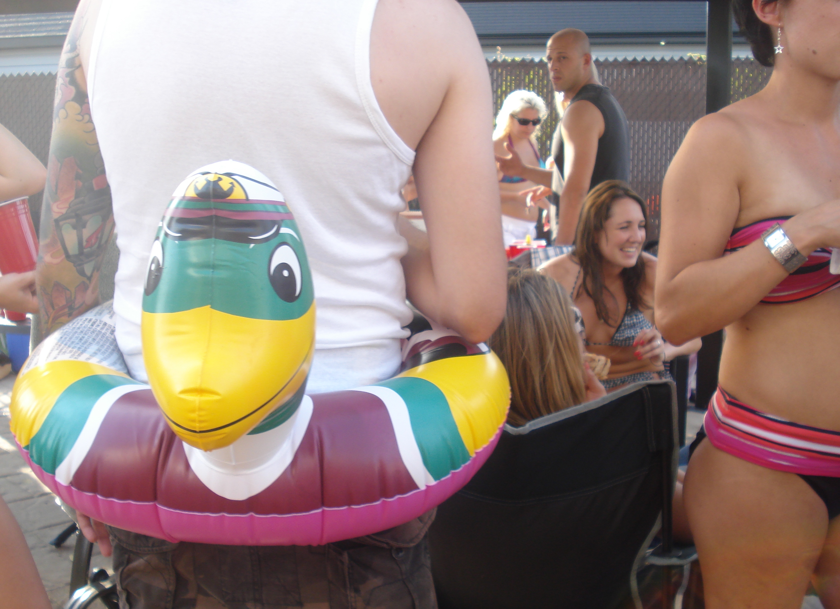 Un mec un peu timide me dit qu’il se sent comme dans une fête organisée par le capitaine de l’équipe de foot d’une école secondaire. J’en entends un autre dire à toutes les filles qu’elles sont gorgeous. Il a un regard de prédateur sexuel en manque. Je nage jusqu’à Alexandre Le Grand, qui s’amuse à faire des plongeons : « Si je continue à les faire comme ça, le manque d’oxygène va me rendre plus saoul que les bières. » Une fille passe et nous offre des shooters au jello et à la vodka. Je secoue la tête, et je dis à mon mec d’en prendre deux, à ma santé.