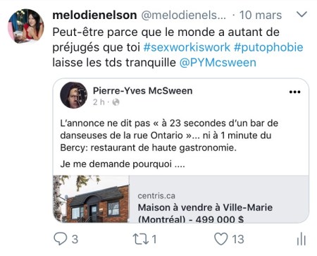 Samedi, le comptable/auteur/chroniqueur Pierre-Yves McSween s’est interrogé sur Facebook à propos d’une annonce immobilière. « L’annonce ne dit pas « à 23 secondes d’un bar de danseuses de la rue Ontario »…ni à 1 minute du Bercy : restaurant de haute gastronomie. Je me demande pourquoi… » Une amie escorte m’a fait parvenir une capture d’écran. Les escortes ne vivent pas enchaînées à un lit de motel : nous nous parlons de tout, des éponges à utiliser quand nous sommes menstruées, des mauvais clients et de tous les jugements qui nous pourrissent la vie, comme celui de Pierre-Yves McSween.