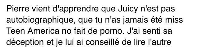Demain je vais lire un extrait de Juicy. Je ne sais pas encore comment je serai habillée ni si je porterai une perruque.
