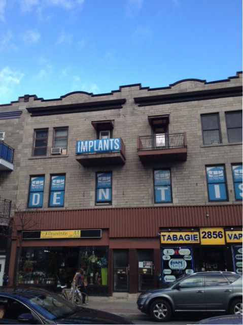 C’est un dentiste qui fait sa pub, mais chaque fois que je lève les yeux, sur Masson, près de ma librairie de quartier préférée, et que je vois en grosses lettres le mot implants, je pense juste à des gros seins, s’exhibant sur un balcon.