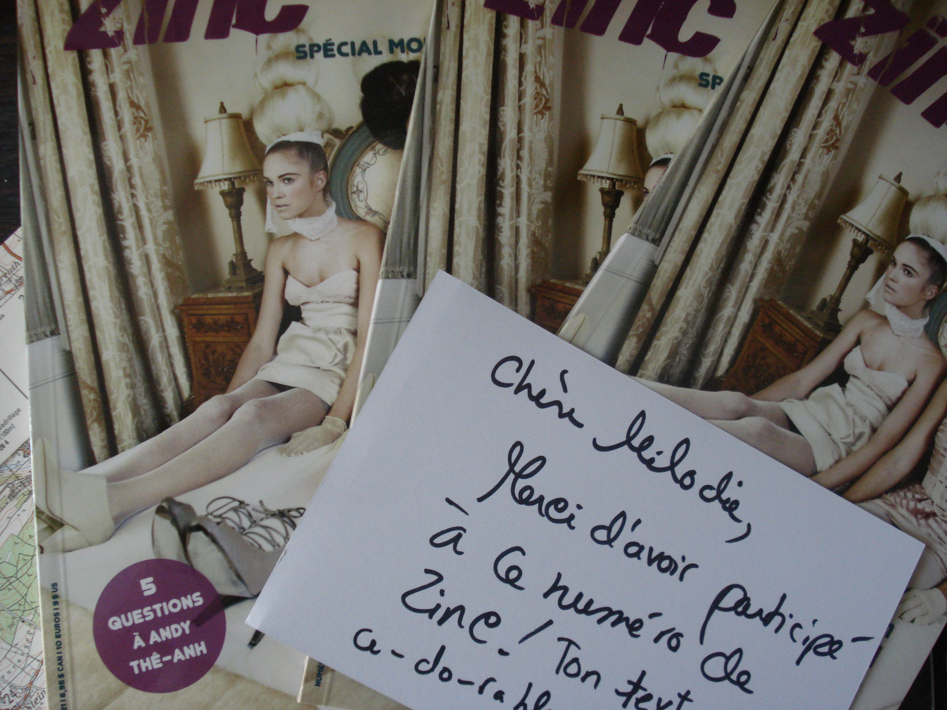 Dans le dernier numéro de la revue littéraire Zinc, il y a une entrevue avec une vendeuse de Tupperware, un texte sur la Major Eating League, et une de mes nouvelles, Du rosé et des poils de basset. Une fille qui fantasme sur Jonathan Adler rencontre au supermarché son ex et sa nouvelle amoureuse, habillée en Juicy Couture.